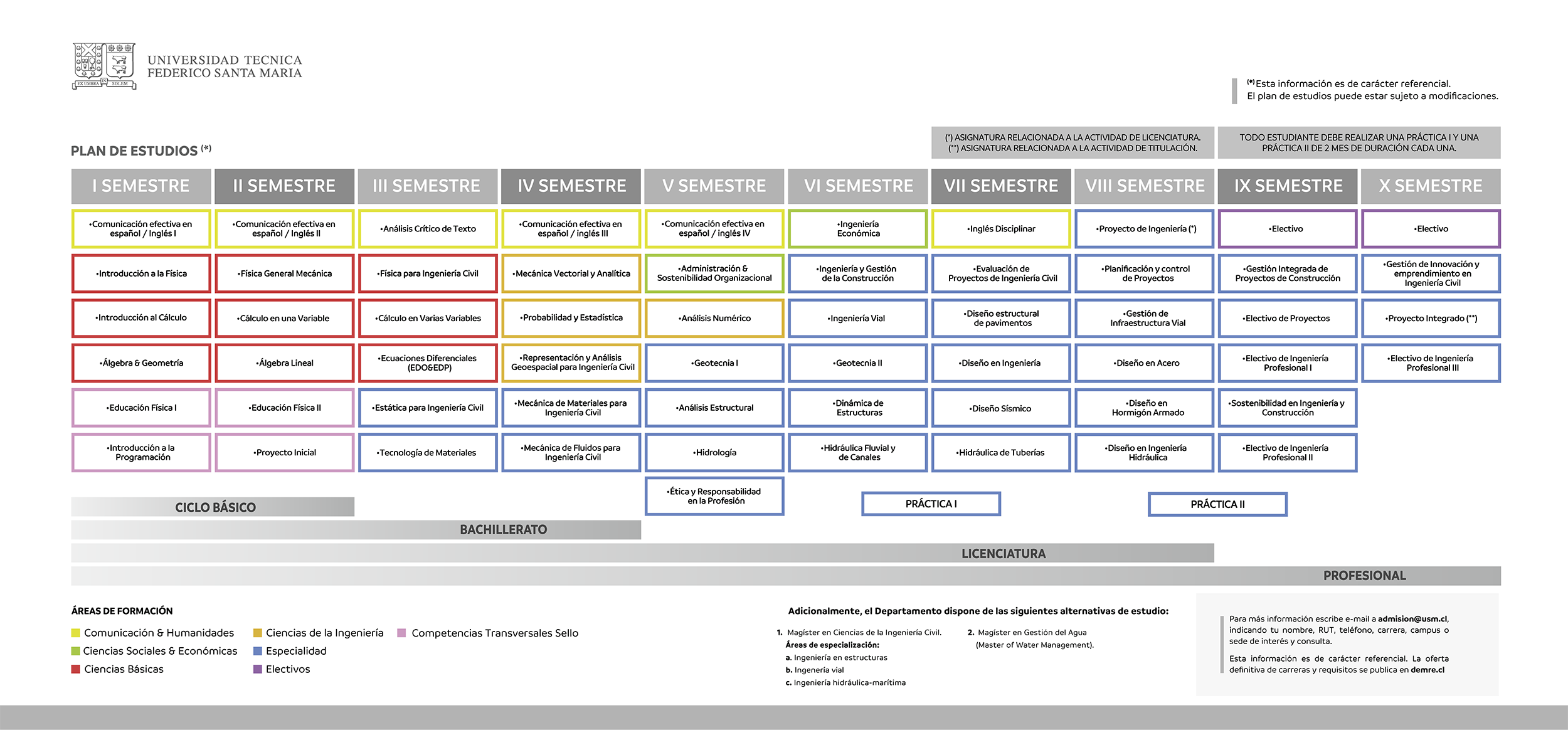 El desarrollo del país demanda el diseño, la evaluación y la construcción de obras de infraestructura y estructuras que contribuyan a la calidad de vida de las personas. Para ello se requiere de profesionales con capacidad técnica que integren equipos y se comuniquen en forma efectiva, con una actitud ética profesional y conscientes del impacto que su labor tiene en la sociedad, aspectos intrínsecos en la formación que ofrece la carrera. La carrera de Ingeniería Civil de la USM, con su formación generalista y de excelencia técnica, provee formación para desempeñarse y desarrollarse en sus distintas etapas profesionales y asumir roles técnicos y directivos, en las diversas subdisciplinas y áreas afines.