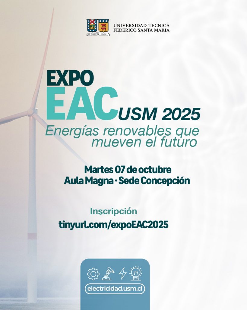 La Universidad Técnica Federico Santa María, a través del Departamento de Electricidad de la Sede Concepción, invita cordialmente a participar de la Expo E.A.C. USM 2025: “Energías Renovables que mueven el futuro”