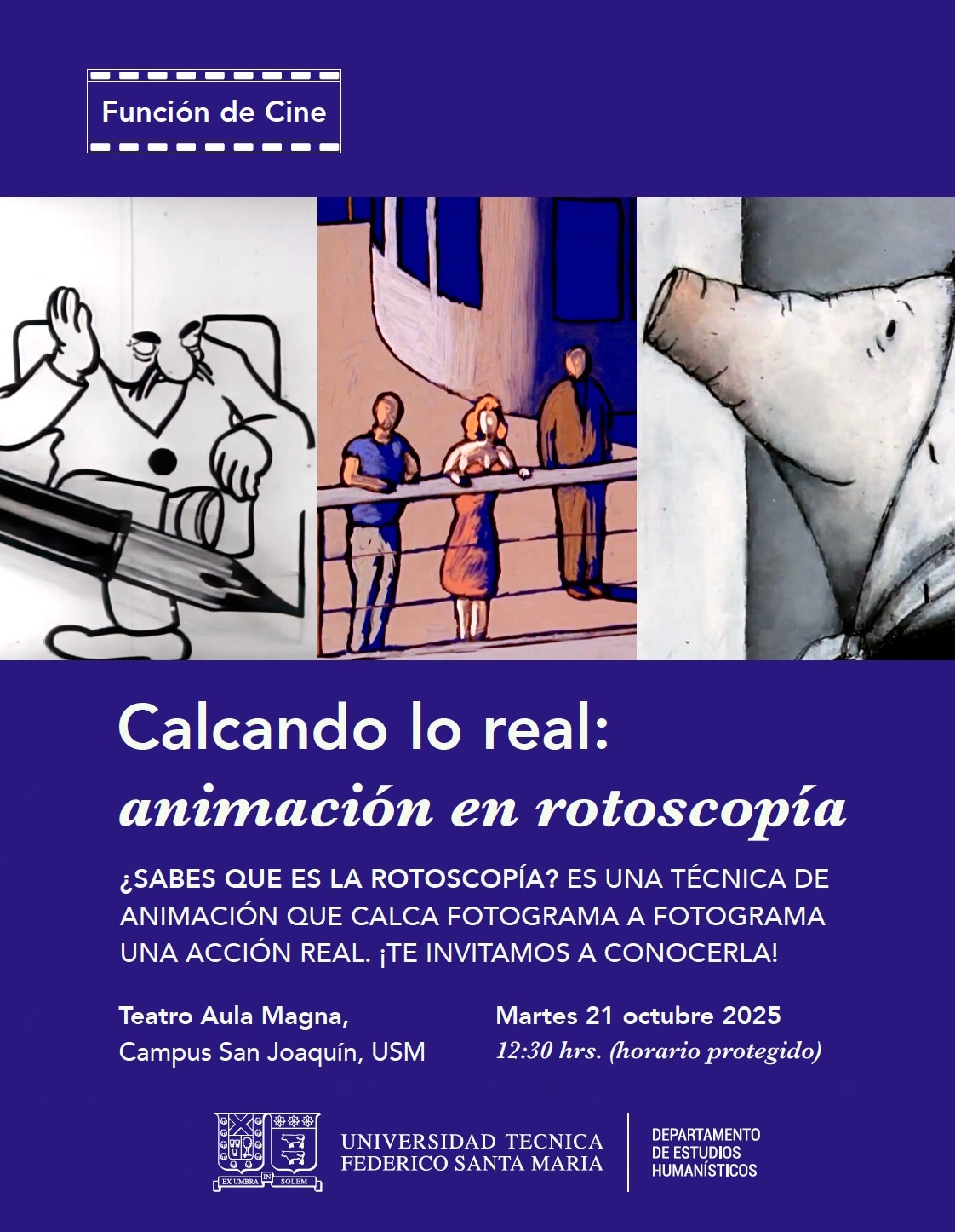 La Universidad Técnica Federico Santa María, a través del Departamento de Estudios Humanísticos, los invita a participar de la función de cine "Calcando lo real: animación en rotoscopía", que será presentada por el profesor del departamento, Héctor Oyarzún.