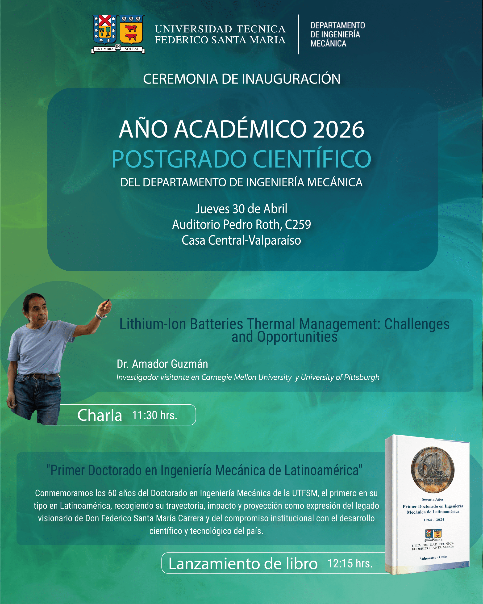 La Universidad Técnica Federico Santa María, a través de su Departamento de Ingeniería Mecánica, les invita cordialmente a participar de la ceremonia de inauguración del año académico de postgrado científico del Departamento de Ingeniería Mecánica 2026.