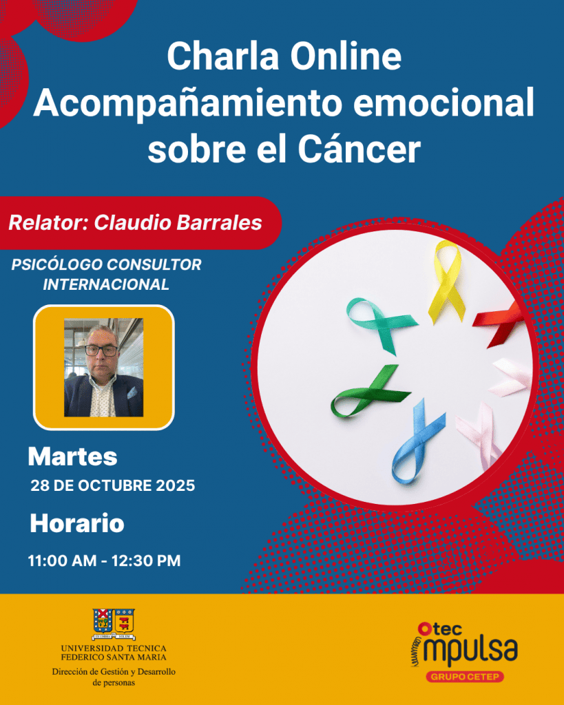 La Universidad Técnica Federico Santa María, a través de su Dirección de Gestión y Desarrollo de Personas y sus unidades de Bienestar e Inclusión Laboral, les invita cordialmente a participar de la charla "Acompañamiento emocional sobre el cáncer", que será presentada por Claudio Barrales, psicólogo consultor internacional de OTEC Impulsa.