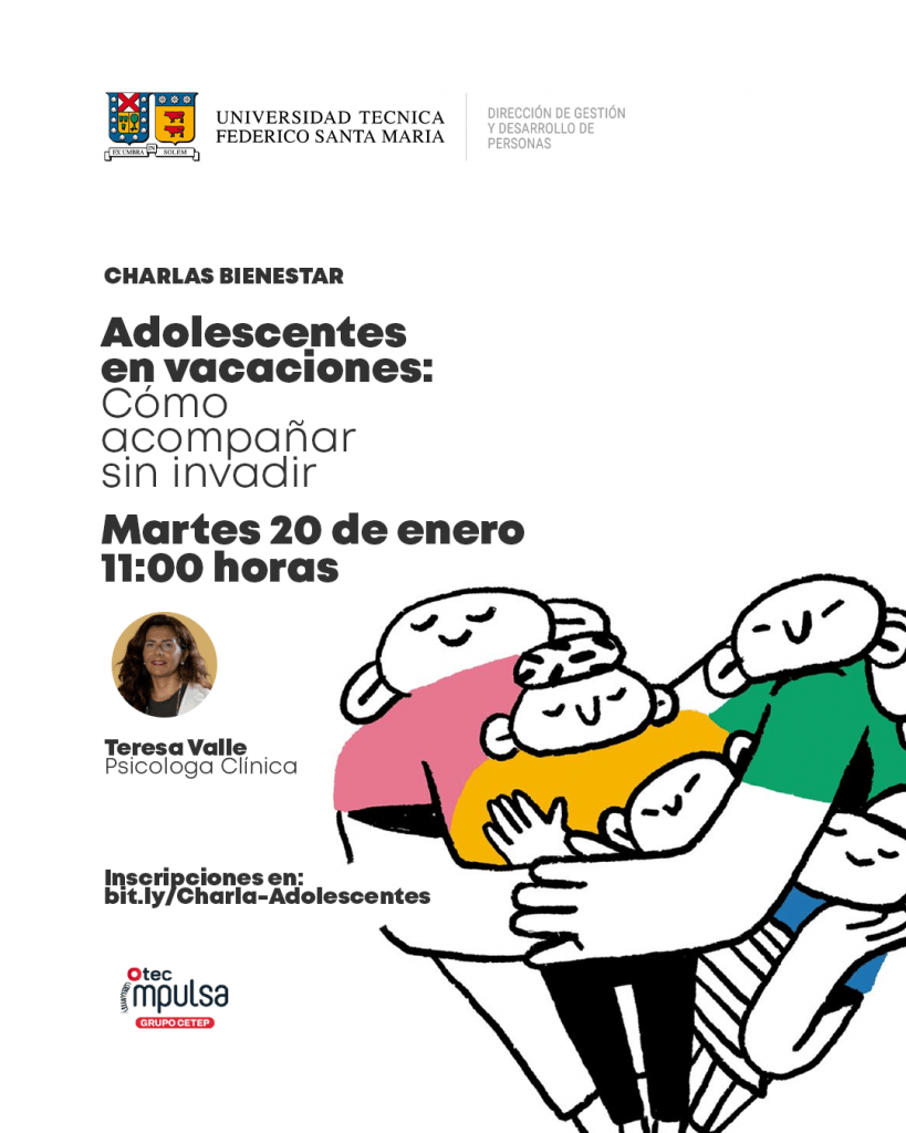 La Universidad Técnica Federico Santa María, a través de su Dirección de Gestión y Desarrollo de Personas, les invita cordialmente a participar de la charla “Adolescentes en vacaciones: Cómo acompañar sin invadir”, que será presentada por Teresa Valle, psicóloga clínica con diplomado en Desarrollo y Salud Integral del Adolescente.