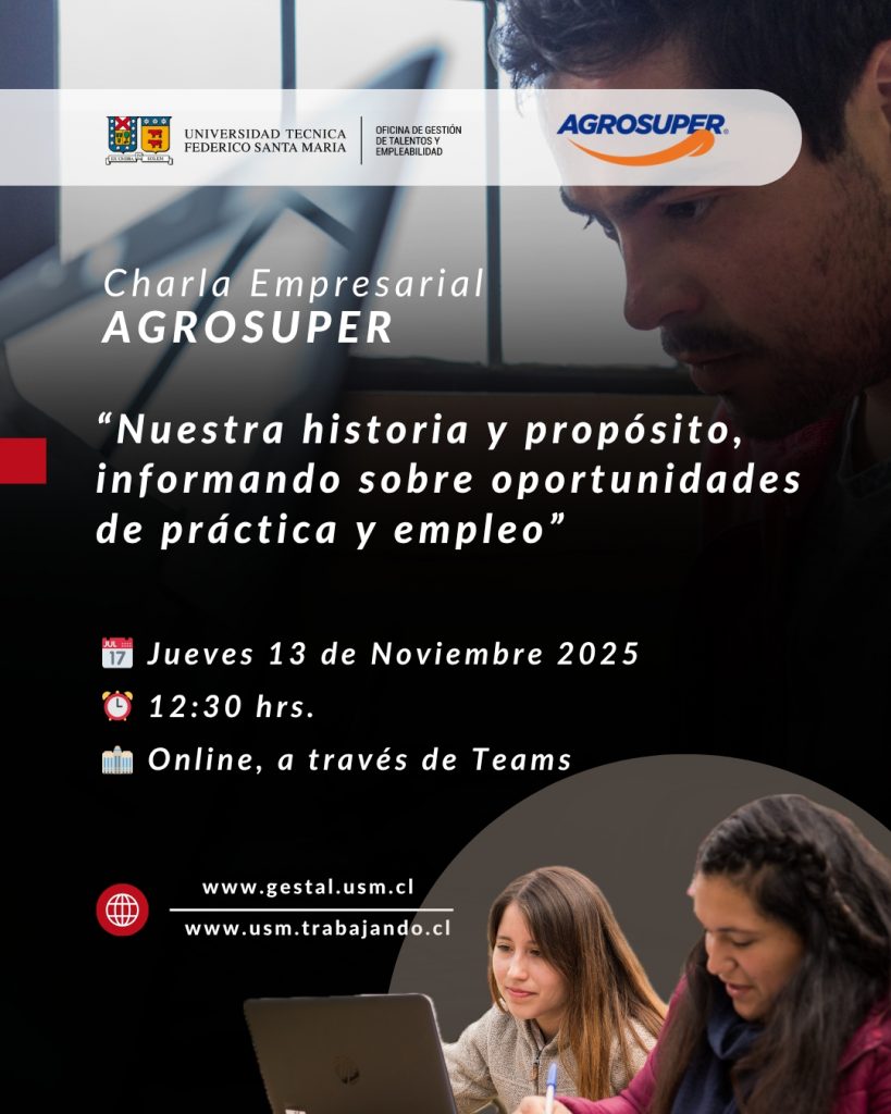 La Universidad Técnica Federico Santa María, a través de su Oficina de Gestión de Talentos, les invita cordialmente a participar de la charla Agrosuper “Nuestra historia y propósito, informando sobre oportunidades de práctica y empleo”.