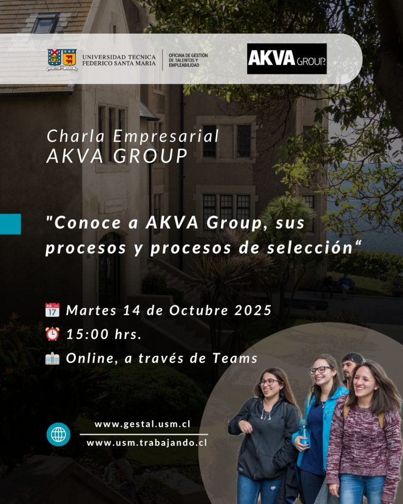 La Universidad Técnica Federico Santa María, a través de su Oficina de Gestión de Talentos, les invita cordialmente a participar de la charla “Conoce a AKVA Group: sus procesos y procesos de selección”, organizada por AKVA Group, empresa internacional especializada en soluciones tecnológicas para la acuicultura.