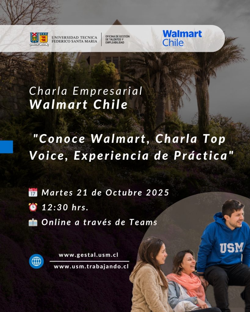 La Universidad Técnica Federico Santa María, a través de su Oficina de Gestión de Talentos, les invita cordialmente a participar de la charla "Conoce Walmart + Charla Top Voice".
