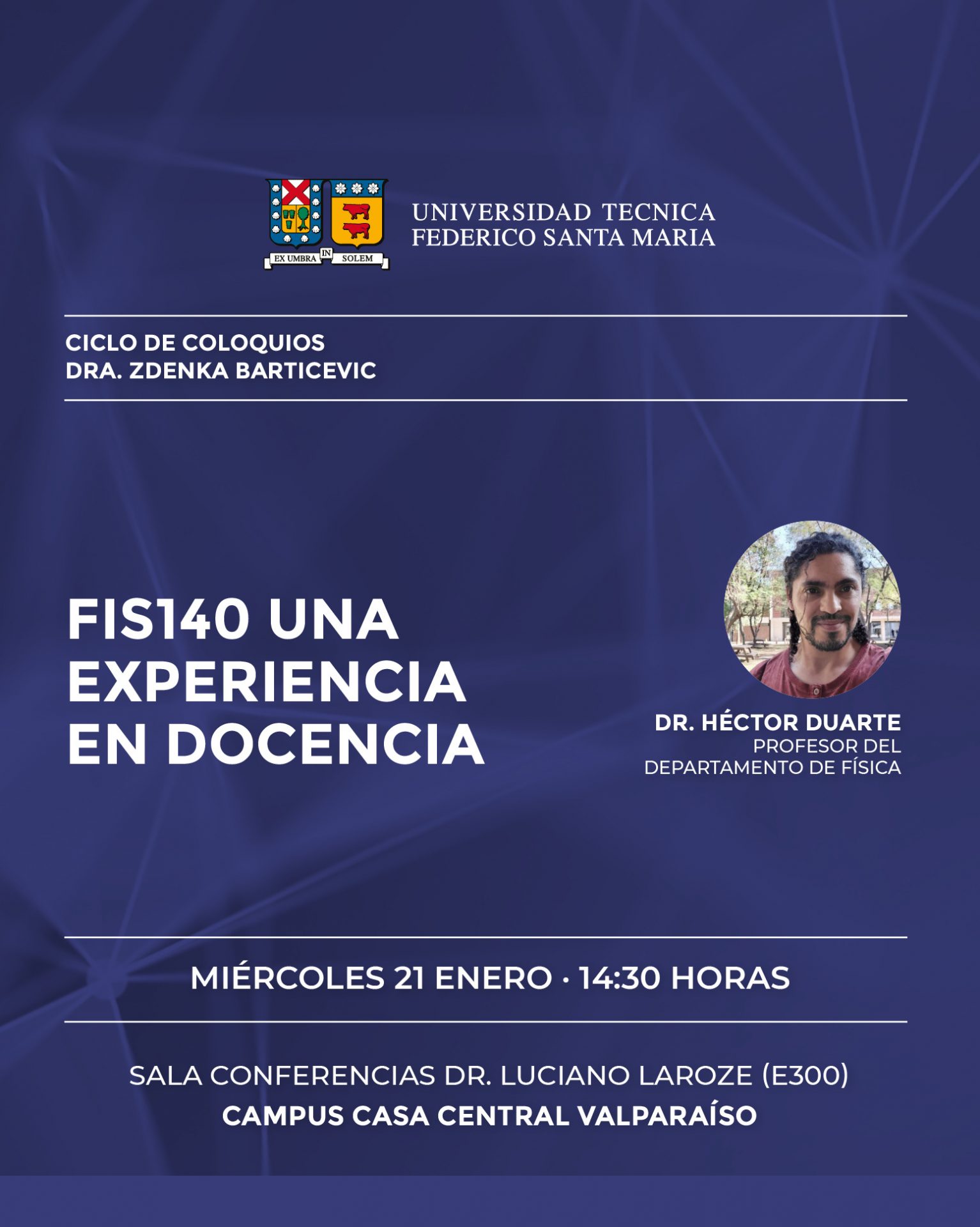 La Universidad Técnica Federico Santa María, a través de su Departamento de Física, les invita cordialmente a participar de la charla "FIS140 una experiencia en docencia", que será presentada por el Dr. Héctor Duarte, profesor de nuestra casa de estudios.