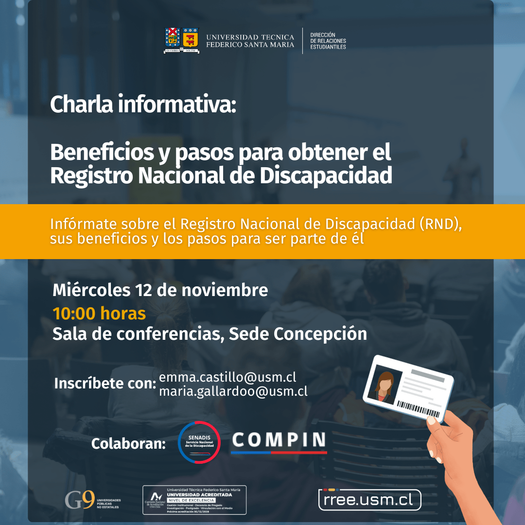 La Universidad Técnica Federico Santa María, a través de su Dirección de Relaciones Estudiantiles y su área de Inclusión, les invita a participar en la charla informativa “Beneficios y pasos para obtener el Registro Nacional de Discapacidad”, instancia abierta a toda la comunidad universitaria.