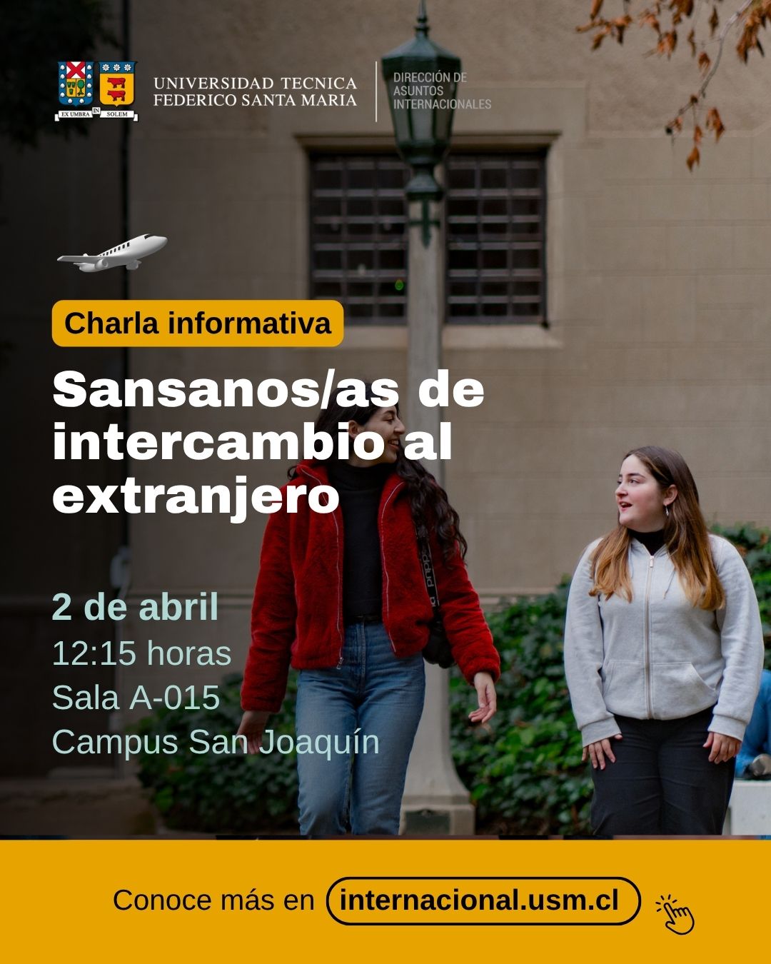 La Universidad Técnica Federico Santa María, a través de su Dirección de Asuntos Internacionales, les invita cordialmente a participar de la charla informativa "Sansanos de intercambio al extranjero", dirigida a estudiantes de carreras de más de ocho semestres y vespertinas interesados en participar en la convocatoria de intercambios para los periodos 2027-1 y 2027-2.