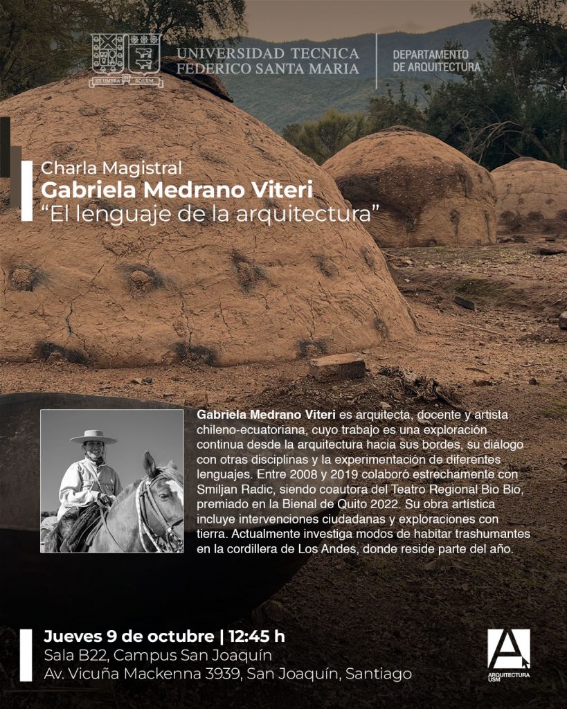 La Universidad Técnica Federico Santa María, a través de su Departamento de Arquitectura, les invita cordialmente a participar de la charla magistral “El lenguaje de la arquitectura”, que será presentada por Gabriela Medrano Viteri.