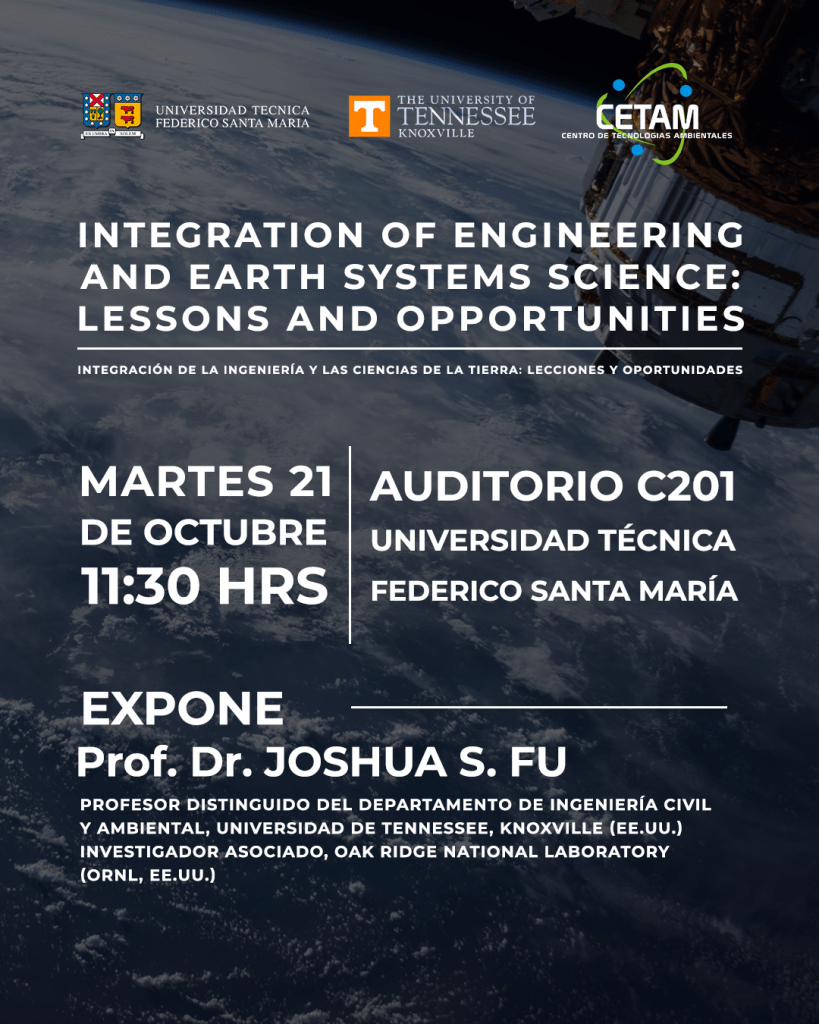 La Universidad Técnica Federico Santa María, a través de su Centro de Tecnologías Ambientales, CETAM, les invita cordialmente a participar de la Charla magistral internacional “Integración de la ingeniería y las ciencias de la Tierra: Lecciones y oportunidades”, que dictará el Dr. Joshua S. Fu, profesor de la Universidad de Tennessee (EE.UU.) e investigador del Oak Ridge National Laboratory (ORNL).