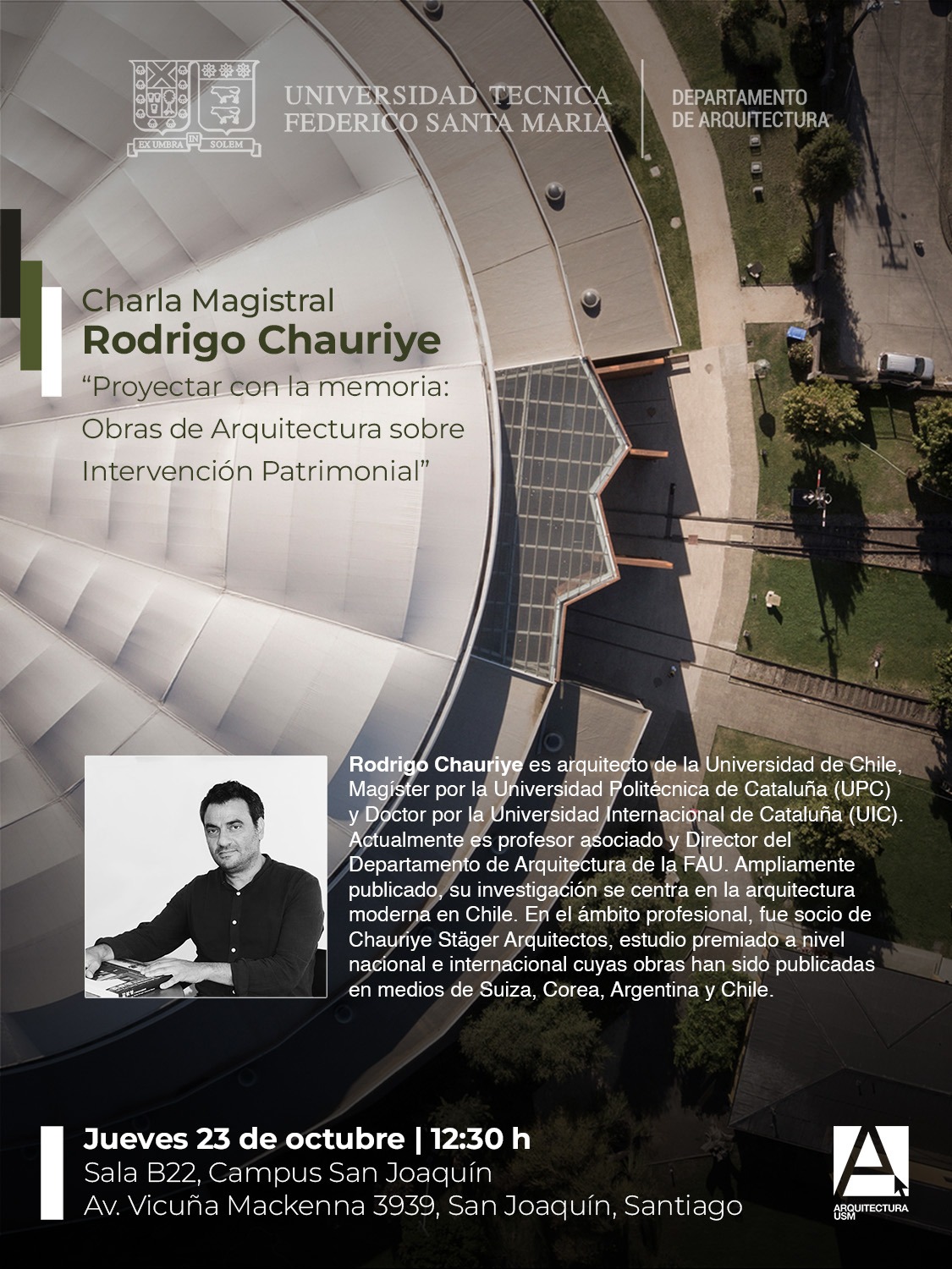 La Universidad Técnica Federico Santa María, a través de su Departamento de Arquitectura, les invita cordialmente a participar de la charla magistral “Proyectar con la memoria: Obras de Arquitectura sobre Intervención Patrimonial”, que presentara el arquitecto Rodrigo Chauriye.