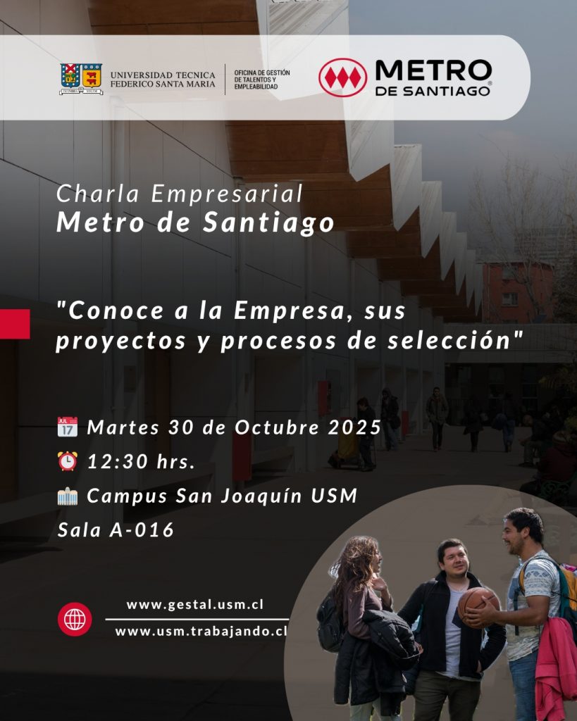 La Universidad Técnica Federico Santa María, a través de su Oficina de Gestión de Talentos, les invita cordialmente a participar de la charla "Conoce a la Empresa, sus proyectos y procesos de selección".