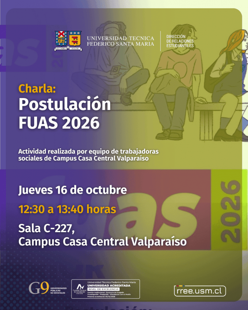 La Universidad Técnica Federico Santa María, a través de su Dirección de Relaciones Estudiantiles, es invita cordialmente a participar de la charla "Postulación FUAS 2026".