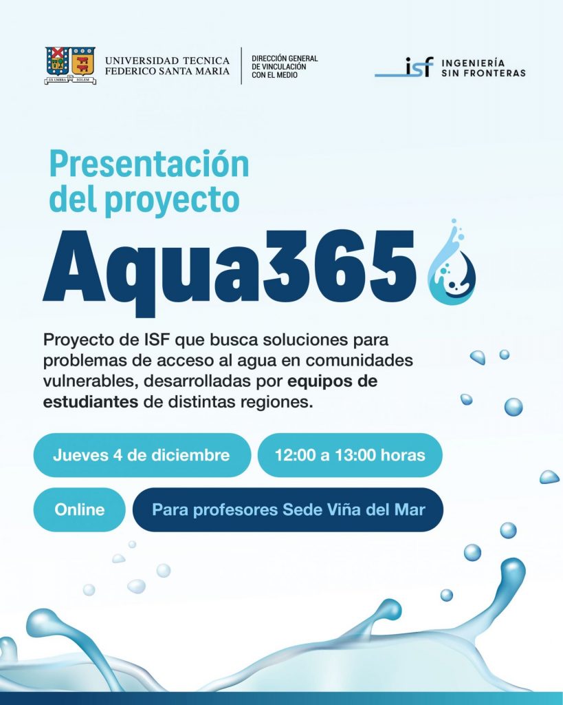 La Dirección de Vinculación con el Medio invita cordialmente a las profesoras y profesores de la USM Sede Viña del Mar a participar en la charla informativa que dictará la Fundación Ingeniería Sin Fronteras (ISF). En esta instancia se presentará el proyecto Aqua365, iniciativa liderada por ISF que será implementada el próximo año en la Región de Valparaíso.