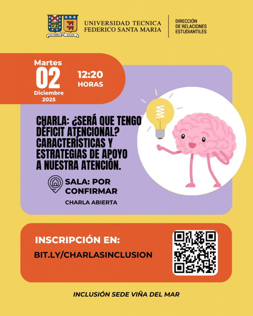 La Universidad Técnica Federico Santa María, a través de la Unidad de Inclusión de la Dirección de Relaciones Estudiantiles de la Sede Viña del Mar, tiene el agrado de invitar a la comunidad a participar de la charla “¿Será que tengo TDAH? Estrategias para mejorar nuestra atención”, instancia que abordará conceptos clave, señales y recomendaciones prácticas para fortalecer la concentración y el bienestar.