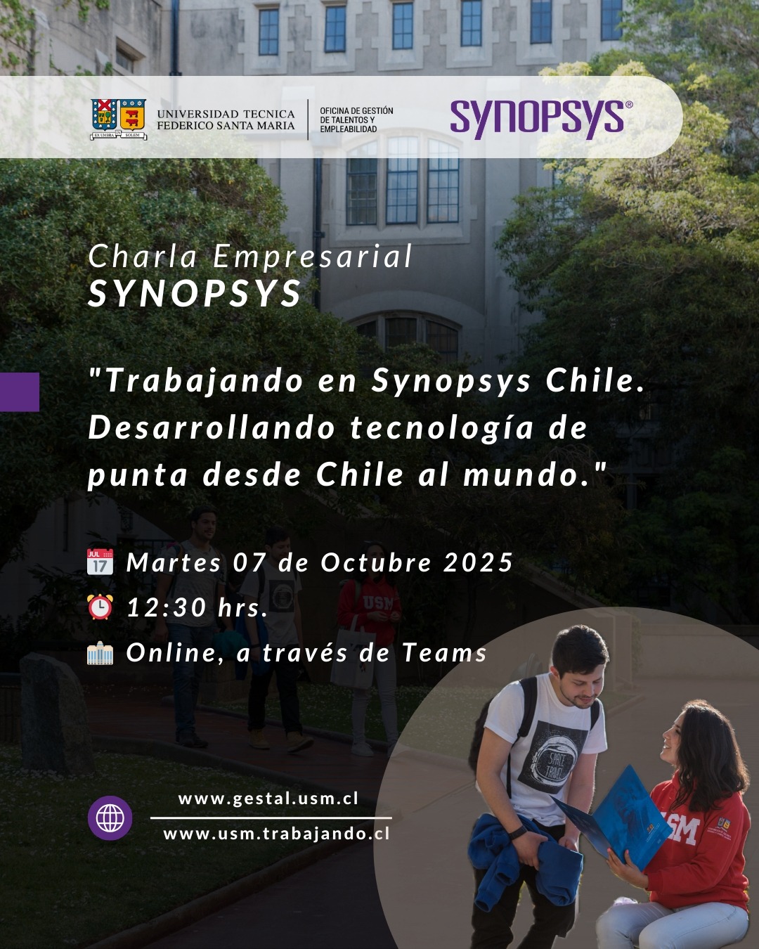 La Universidad Técnica Federico Santa María, a través de su Oficina de Gestión de Talentos,  les invita cordialmente a participar de la charla “Trabajando en Synopsys Chile. Desarrollando tecnología de punta desde Chile al mundo”, organizada por la empresa Synopsys, líder global en diseño de semiconductores y soluciones tecnológicas innovadoras.