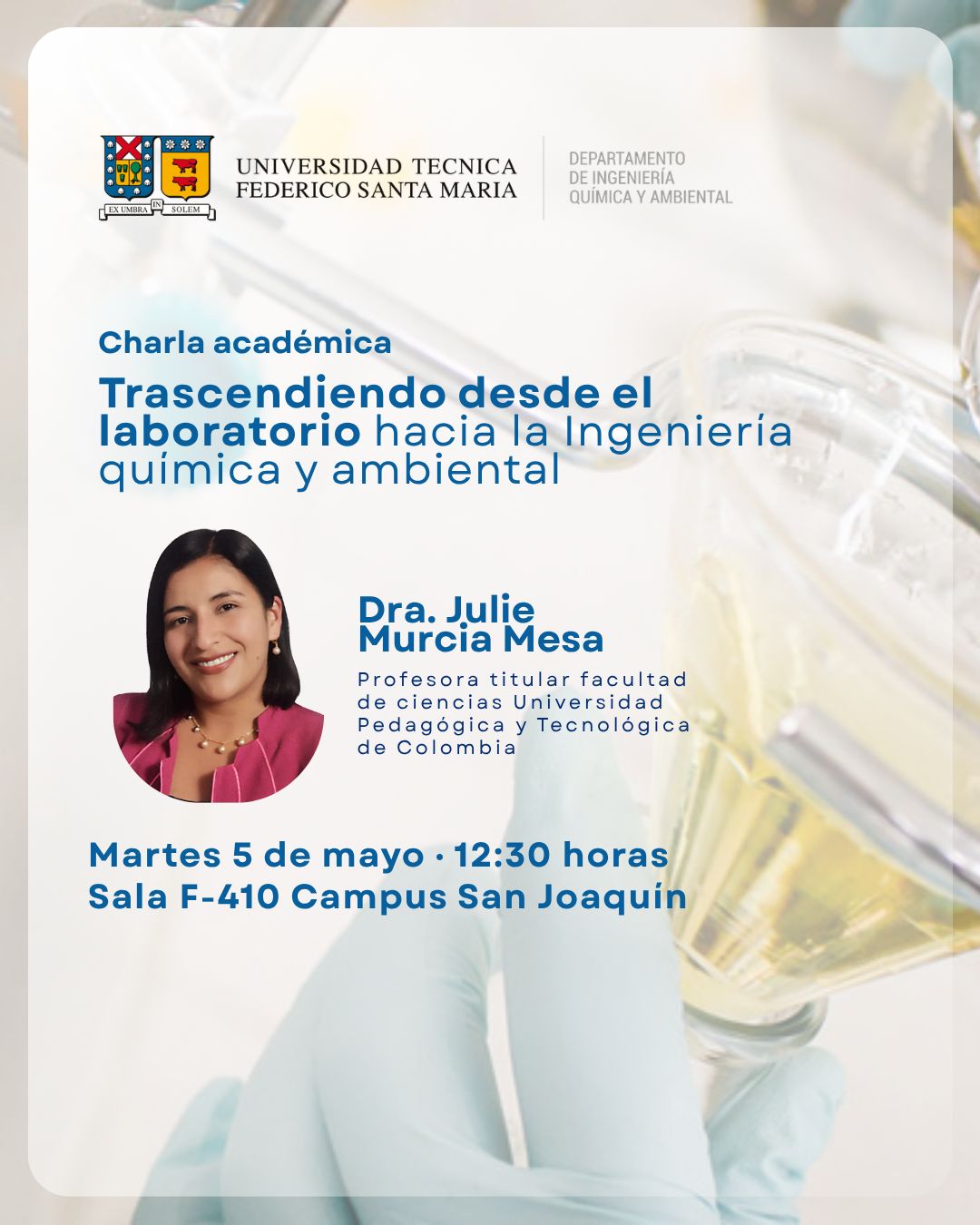 La Universidad Técnica Federico Santa María, a través de su Departamento de Ingeniería Química y Ambiental, invita a la comunidad universitaria a la charla académica "Trascendiendo desde el laboratorio hacia la ingeniería química y ambiental", que será dictada por la Dra. Julie Murcia, profesora titular de la Universidad Pedagógica y Tecnológica de Colombia.