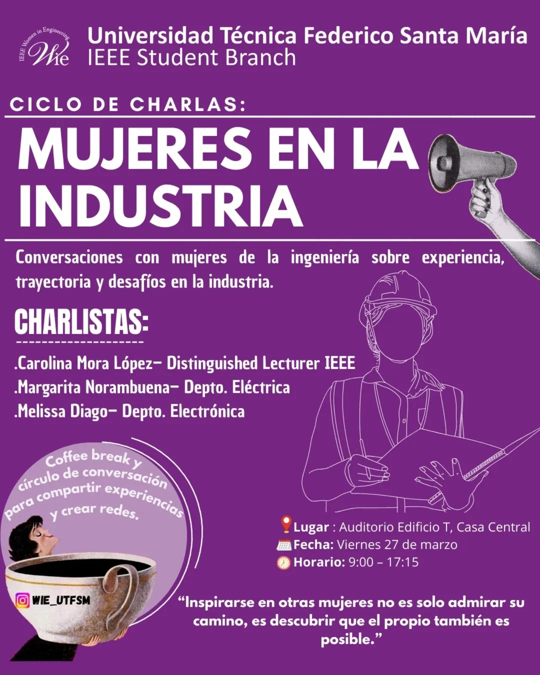 La Universidad Técnica Federico Santa María, a través de su Dirección de Relaciones Estudiantiles, les invita cordialmente a participar del ciclo de charlas "Mujeres en la industria".