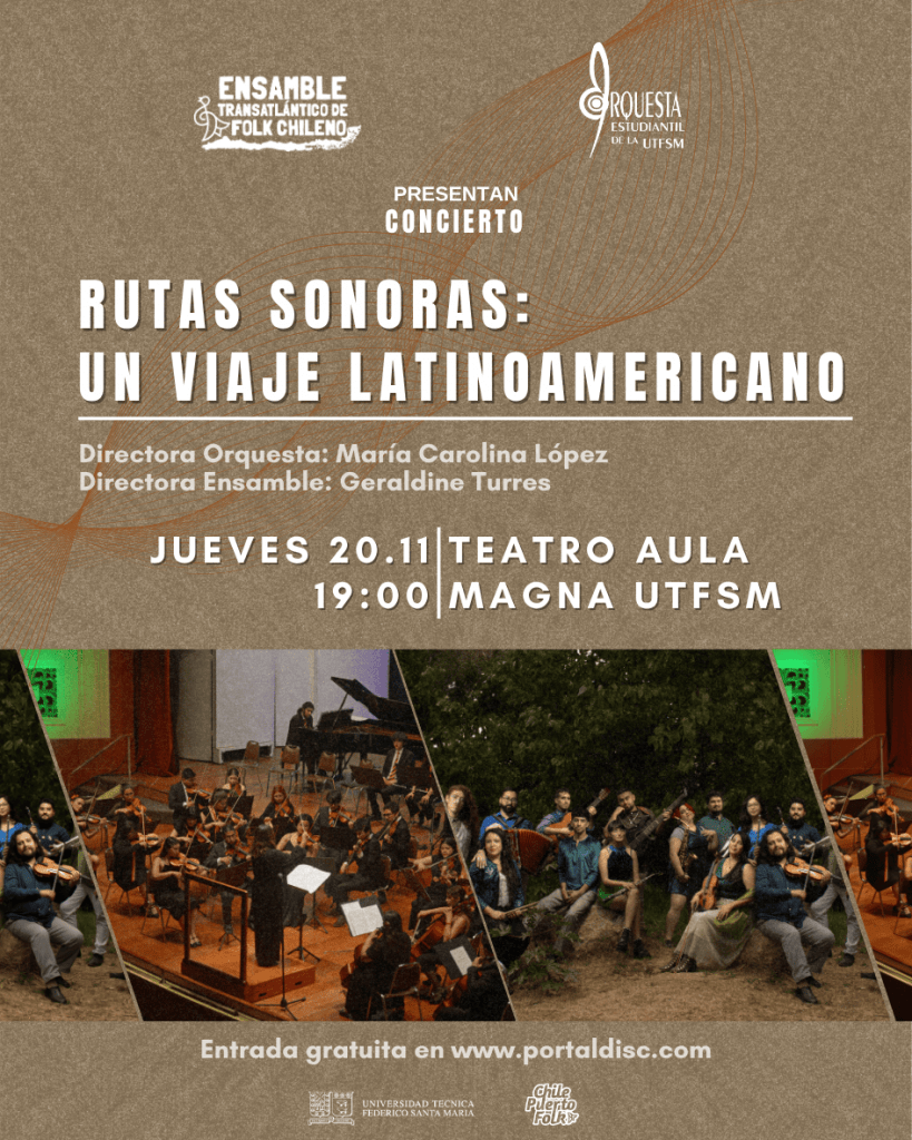 La Universidad Técnica Federico Santa María, a través de su Orquesta Estudiantil y el Ensamble Transatlántico de Folk Chileno presentan “Rutas Sonoras: Un viaje latinoamericano”, un concierto que invita a recorrer las sonoridades y tradiciones musicales del continente, desde el sur de Chile hasta el Caribe.