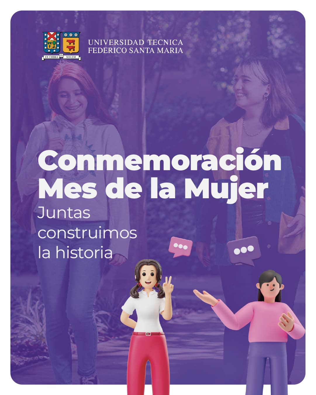 La Universidad Técnica Federico Santa María, a través de su Dirección de Género y en conjunto con distintas direcciones, departamentos y organizaciones internas, les invitan cordialmente a participar de la Conmemoración del Mes de la Mujer.