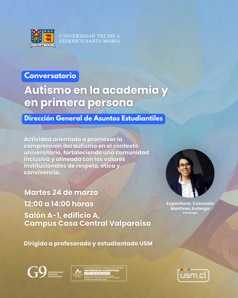 La Universidad Técnica Federico Santa María, a través de su Dirección General de Asuntos Estudiantiles, les invita cordialmente a participar del conversatorio "Autismo en la academia y en primera persona".