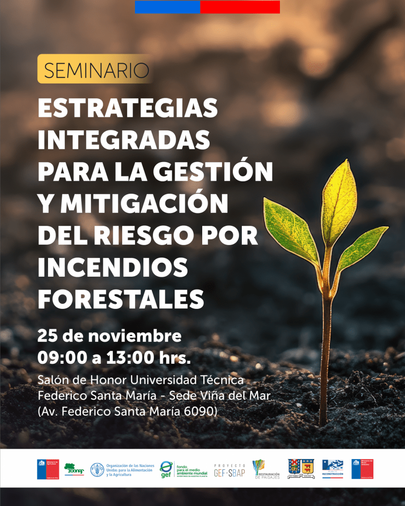 En el marco del Plan de Reconstrucción por Incendios de la Región de Valparaíso 2024, el Ministerio del Medio Ambiente, en colaboración con la Corporación Nacional Forestal (CONAF), el Proyecto GEF Restauración de Paisajes, el Proyecto GEF SBAP y el Equipo de Ciencia Forestal Aplicada de la Universidad Técnica Federico Santa María (ECIFA), invita a participar en el seminario “Estrategias integradas para la gestión y mitigación del riesgo por incendios forestales”.