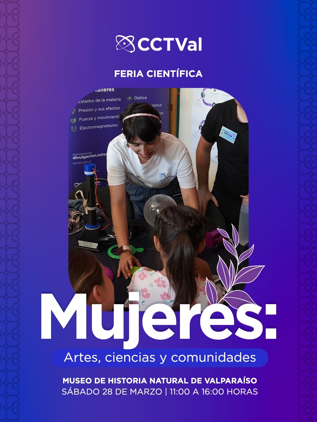 La Universidad Técnica Federico Santa María, a través de su Centro Científico Tecnológico de Valparaíso, CCTVal, les invita cordialmente a participar de la Feria Científica de Mujeres "Artes, ciencias y comunidades".