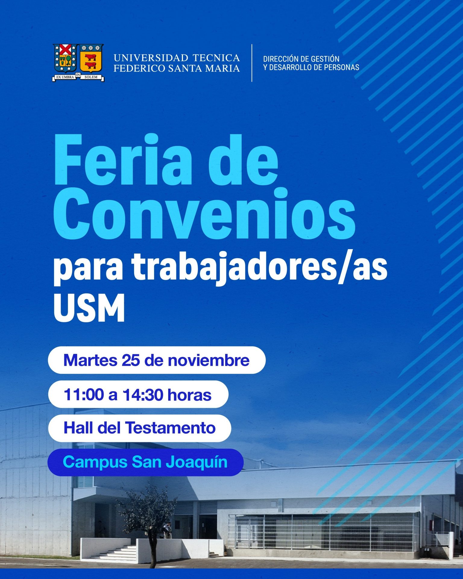 La Universidad Técnica Federico Santa María, a través de la Dirección de Gestión y Desarrollo de Personas, invita cordialmente a la comunidad docente y funcionaria a participar en la Feria de convenios para trabajadores(as) 2025, instancia que busca dar a conocer los distintos beneficios y alianzas disponibles para nuestros colaboradores.