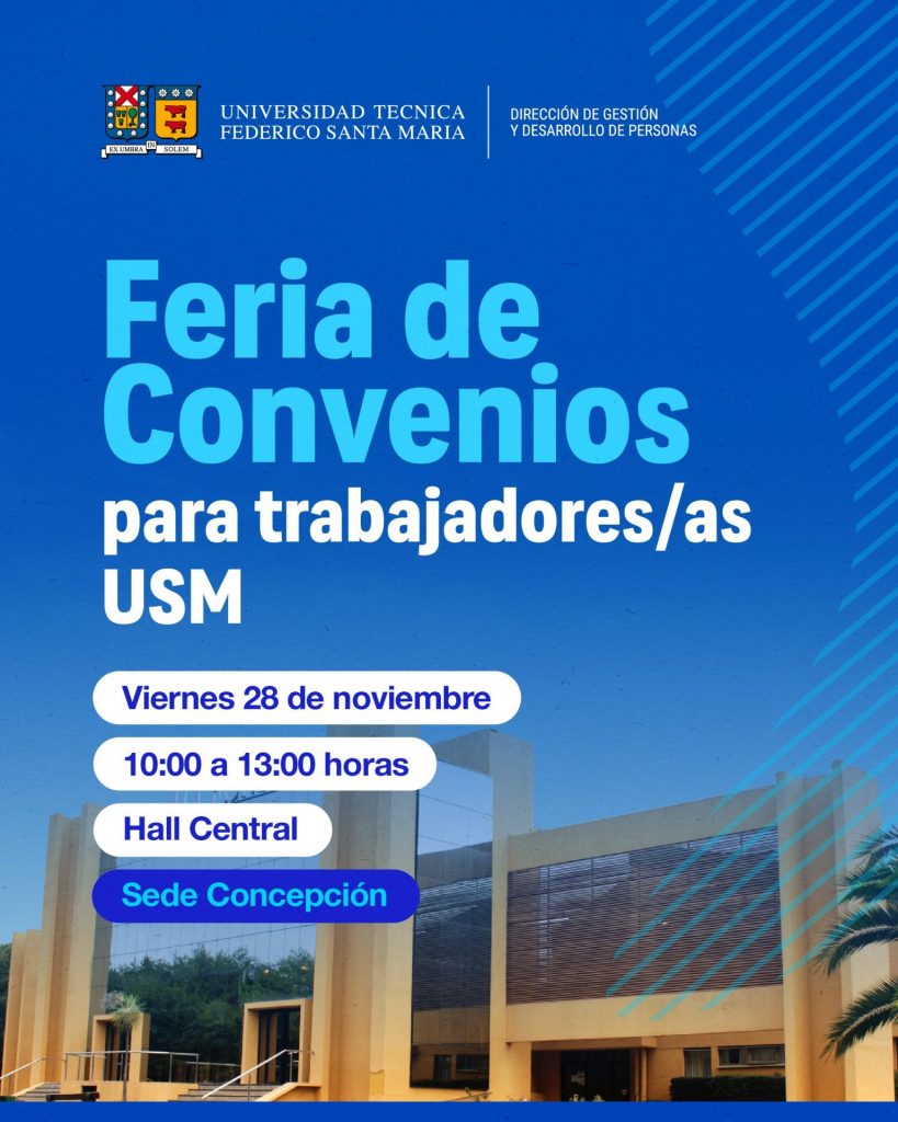 La Universidad Técnica Federico Santa María, a través de la Dirección de Gestión y Desarrollo de Personas, invita cordialmente a la comunidad docente y funcionaria a participar en la Feria de convenios para trabajadoras y trabajadores 2025, instancia que busca dar a conocer los distintos beneficios y alianzas disponibles para nuestros colaboradores.