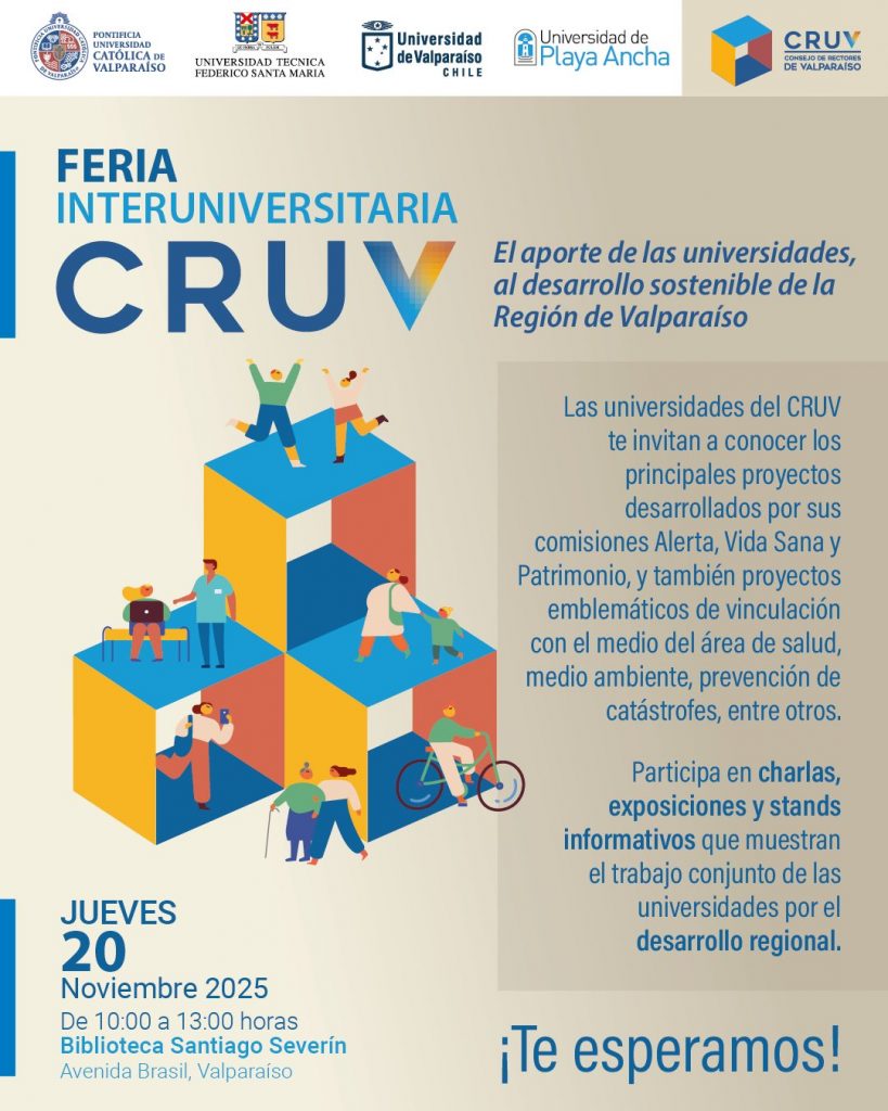 La Universidad Técnica Federico Santa María les invita cordialmente a participar de la Feria Interuniversitaria CRUV, que contará con charlas, exposiciones y stands informativos de las universidades del Consejo de Rectores de Valparaíso, CRUV.
