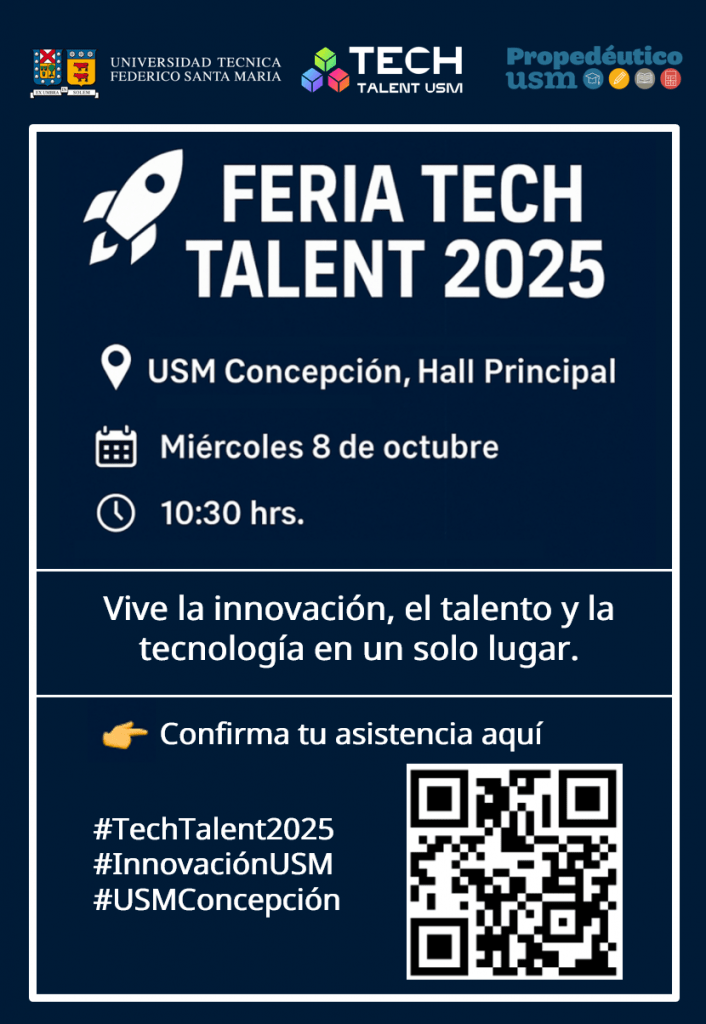 La Universidad Técnica Federico Santa María, Sede Concepción, invita a la Feria TechTalent 2025, instancia que marca el cierre de 16 semanas de trabajo y aprendizaje. En esta ocasión, 64 estudiantes de enseñanza media, organizados en 17 equipos, presentarán sus proyectos innovadores.