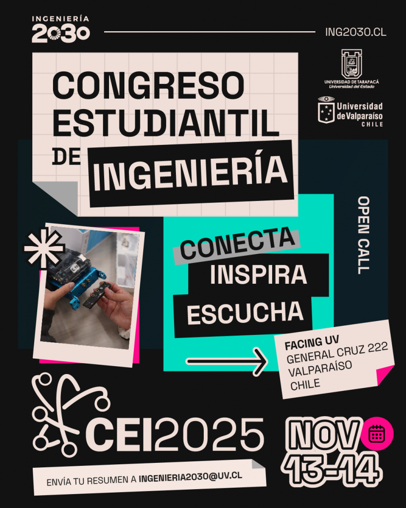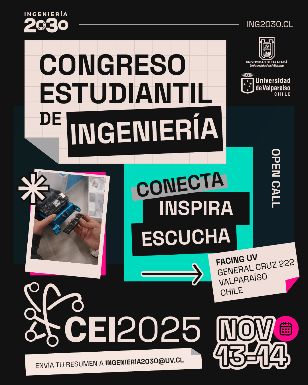 La Universidad Técnica Federico Santa María les invita cordialmente a participar del II Congreso de Estudiantes en Ingeniería (CEI 2025), una instancia impulsada por el Proyecto Ingeniería 2030 que une en consorcio a las Universidades de Valparaíso y Tarapacá para potenciar el desarrollo académico, la investigación y la innovación en las/los futuras/os ingenieras/os del país.