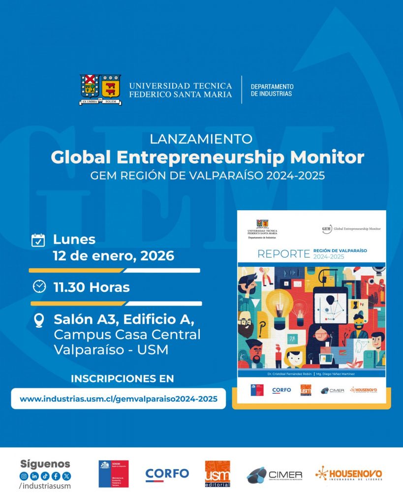 La Universidad Técnica Federico Santa María, a través su Departamento de Industrias, les invita cordialmente a participar del Lanzamiento del Reporte Global Entrepreneurship Monitor – GEM Región de Valparaíso 2024-2025, herramienta para conocer más al detalle la actividad emprendedora del territorio, actuando como un soporte a la generación y mejora de políticas público-privadas en torno al emprendimiento.