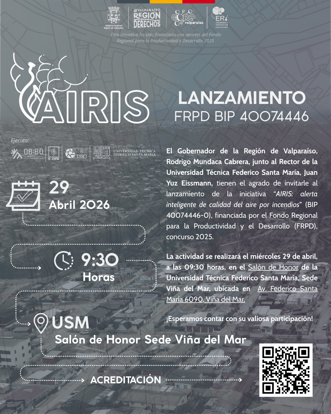 La Universidad Técnica Federico Santa María, a través de su Equipo de Ciencia Forestal Aplicada (E-CIFA), tiene el agrado de invitar a la comunidad al lanzamiento del proyecto AIRIS: Alerta Inteligente de Calidad del Aire por Incendios.