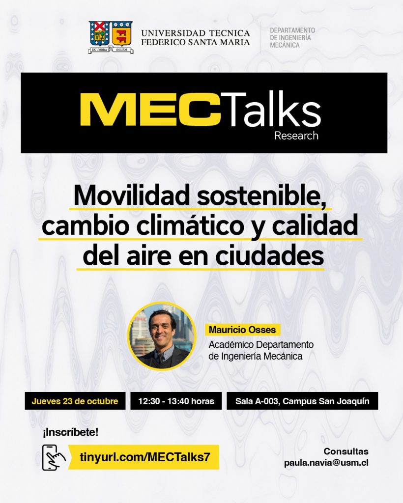 La Universidad Técnica Federico Santa María, a través del Departamento de Ingeniería Mecánica, invita a la comunidad a participar de la charla "Movilidad sostenible, cambio climático y calidad del aire en ciudades", que será dictada por Mauricio Osses, académico del Departamento de Ingeniería Mecánica.