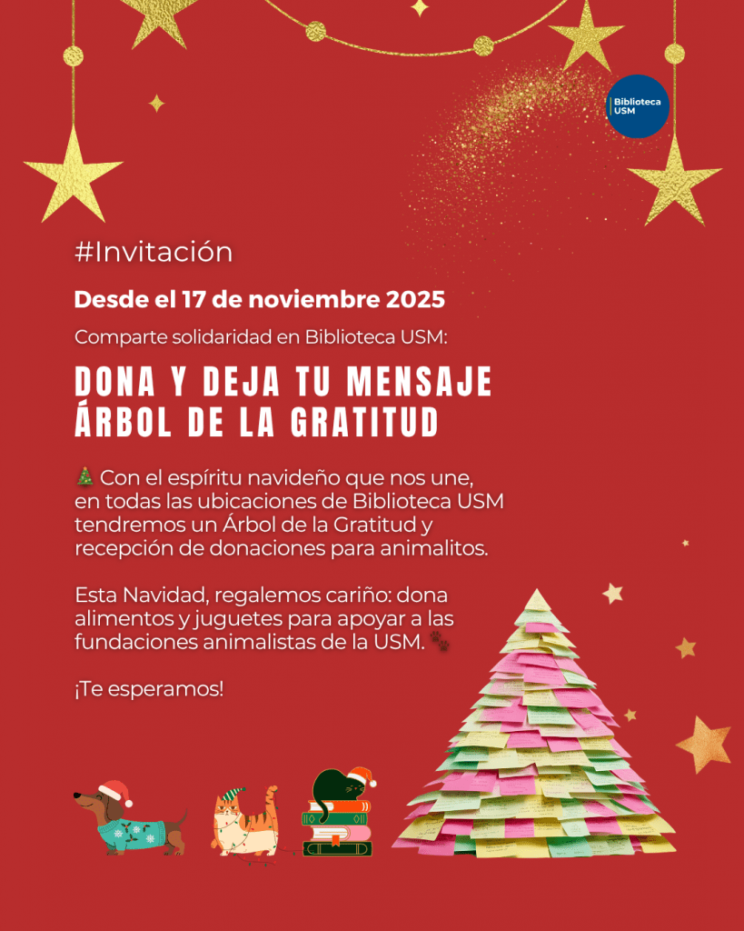 En todas las Bibliotecas USM se encontrará el Árbol de la Gratitud, en donde podrán escribir un mensaje navideño, sus propósitos 2026, y recepción de donaciones para animales.