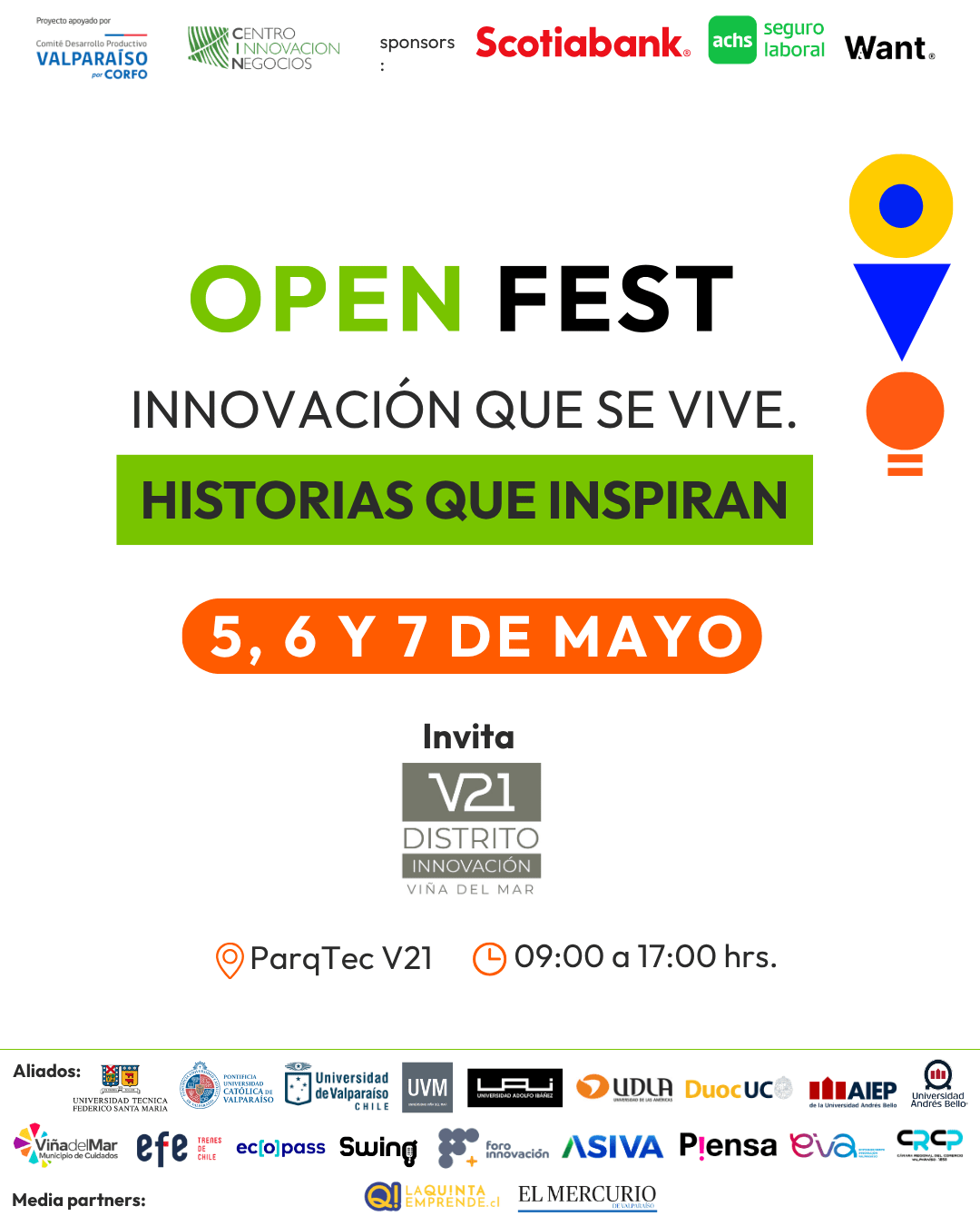 La Universidad Técnica Federico Santa María, a través de su Dirección General de Investigación, Innovación y Emprendimiento, les invita cordialmente a participar del V21 Open Fest 2026, encuentro gratuito que reunirá a referentes de la innovación para compartir e inspirar a través de sus experiencias sobre el desarrollo del ecosistema.