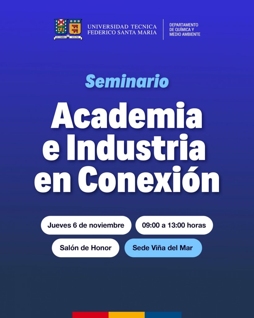 El Departamento de Química y Medio Ambiente tiene el agrado de invitar a toda la comunidad universitaria y público interesado a participar en el Seminario “Academia e Industria en Conexión”, que se realizará el jueves 6 de noviembre, de 09:00 a 13:00 horas, en el Salón de Honor de la Sede Viña del Mar.