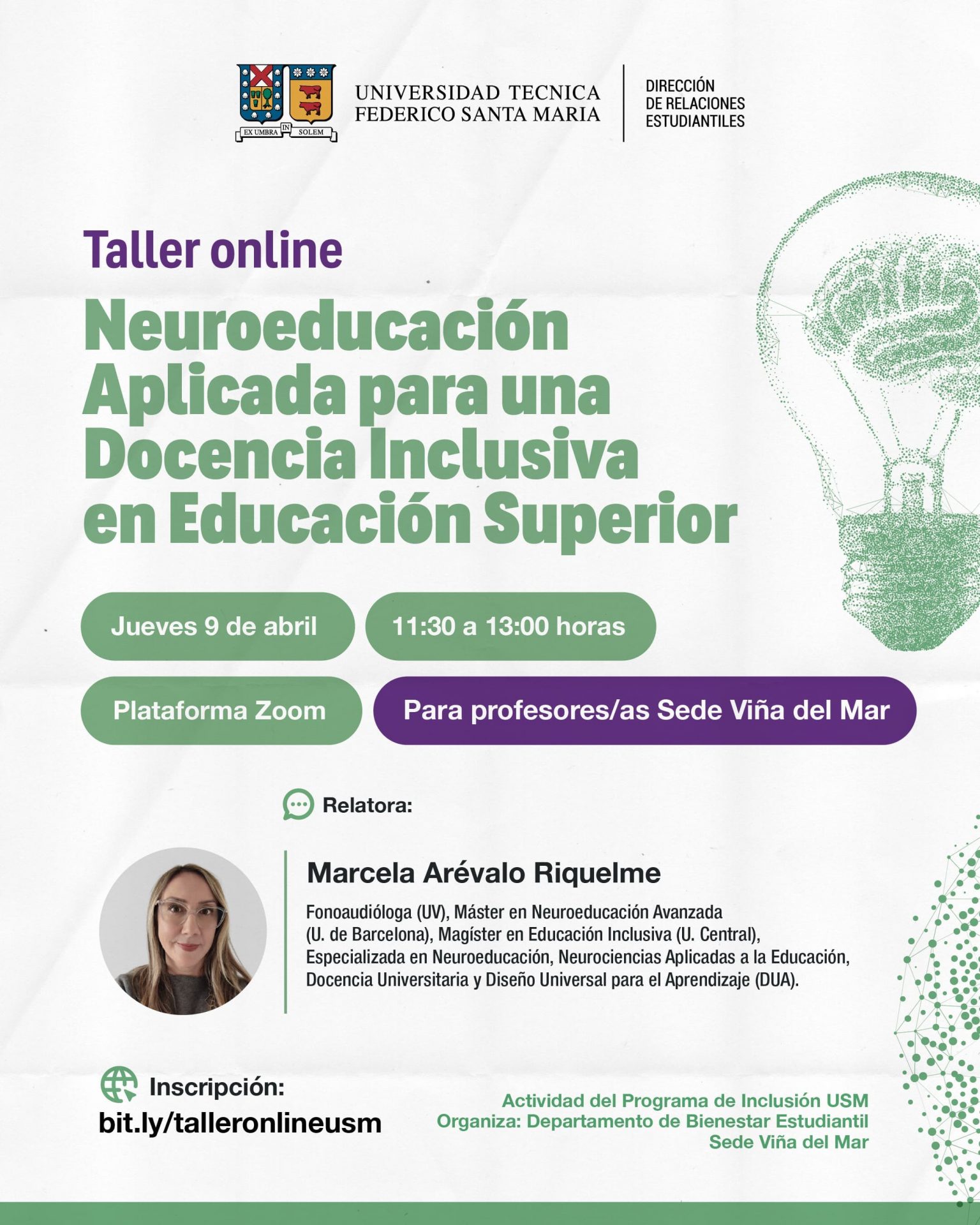 El Departamento de Bienestar Estudiantil de la Sede Viña del Mar, a través de su Programa de Inclusión, tiene el agrado de invitar a sus docentes a participar en el taller online: “Neuroeducación Aplicada para una Docencia Inclusiva en Educación Superior”.