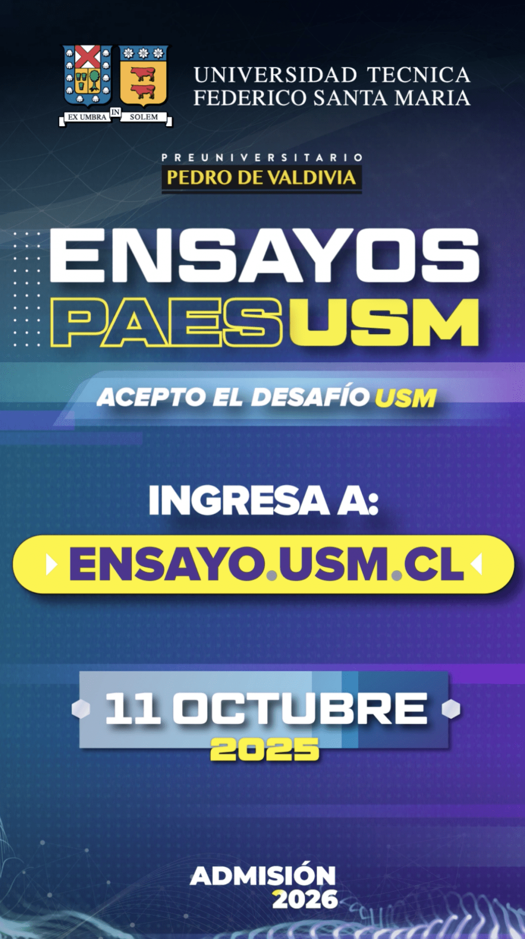 La Dirección General de Admisión en el marco de la semana de “Puertas Abiertas” 2025, los invita cordialmente a participar del último ensayo PAES (Prueba de Acceso a la Educación Superior) del ciclo 2025 que organiza nuestra institución, en conjunto con el Preuniversitario Pedro de Valdivia.