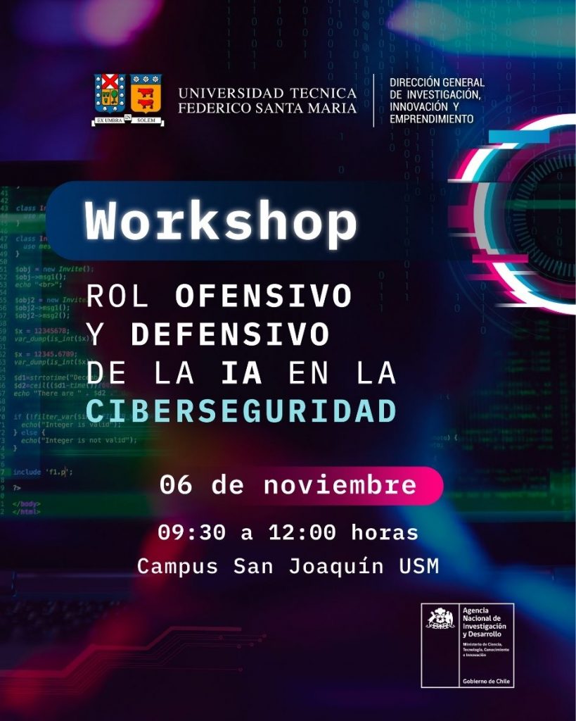 La Universidad Técnica Federico Santa María, a través de su Dirección General de Investigación, Innovación y Emprendimiento y su proyecto institucional InES I+D, les invita cordialmente a participar del workshop "Rol ofensivo y defensivo de la IA en la ciberseguridad", un espacio donde podrás conocer las proyecciones y las últimas tendencias en seguridad informática.