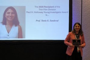 La Dra. Tania Sandoval, del Departamento de Ingeniería Química y Ambiental, fue reconocida por la American Vacuum Society (AVS) con el galardón “Thin Film Division Paul Holloway Young Investigator Award”, convirtiéndose en la primera mujer y la primera latinoamericana en recibir este premio.