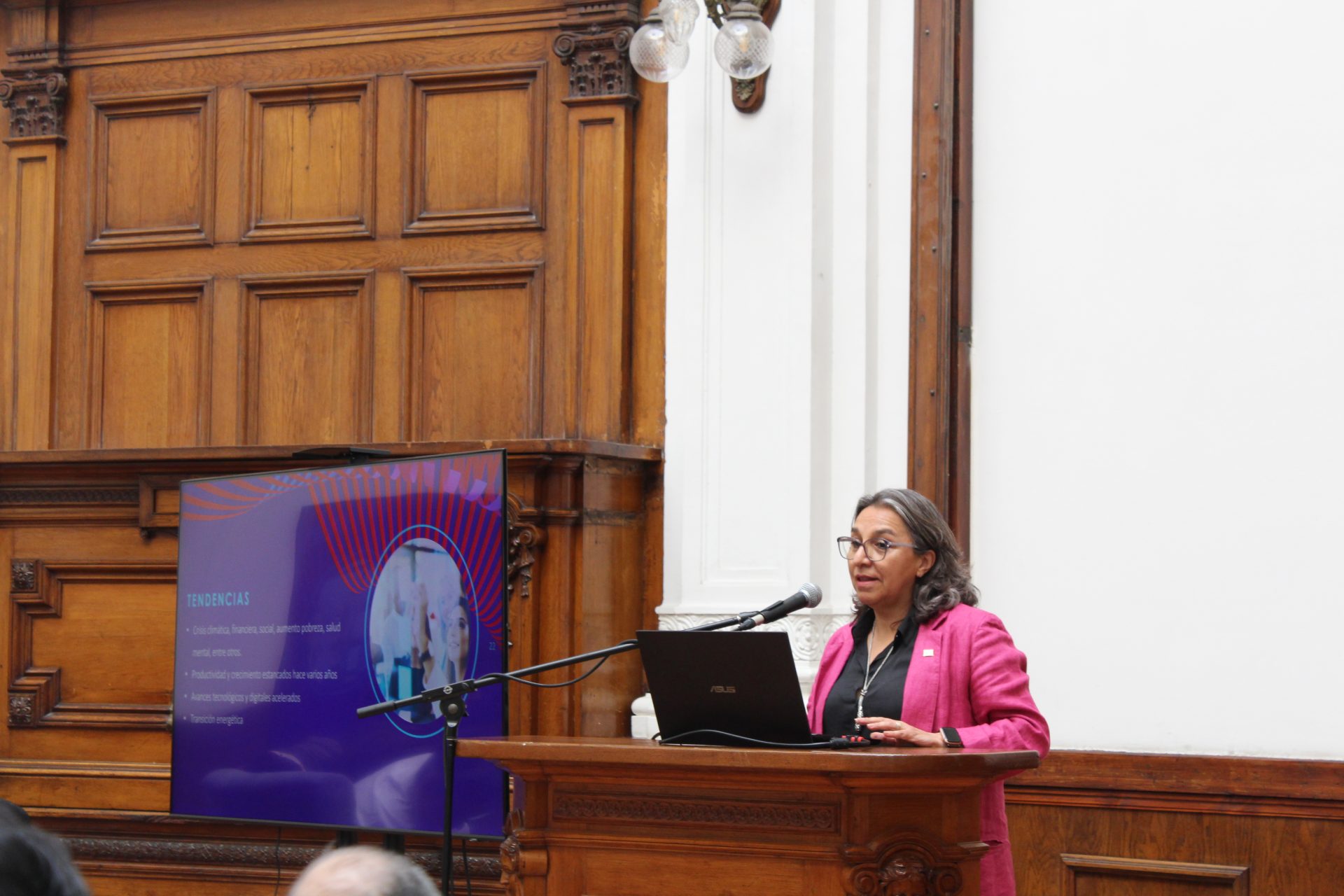 Por su parte, Nancy Pérez, se refirió a la tendencia actual ligada a la crisis climática, financiera, social y en salud, por nombrar algunas, unidas a un estancamiento de la productividad y el crecimiento, pero, por otro lado, con avances tocológicos y digitales avanzados que van de la mano de la transición energética.
