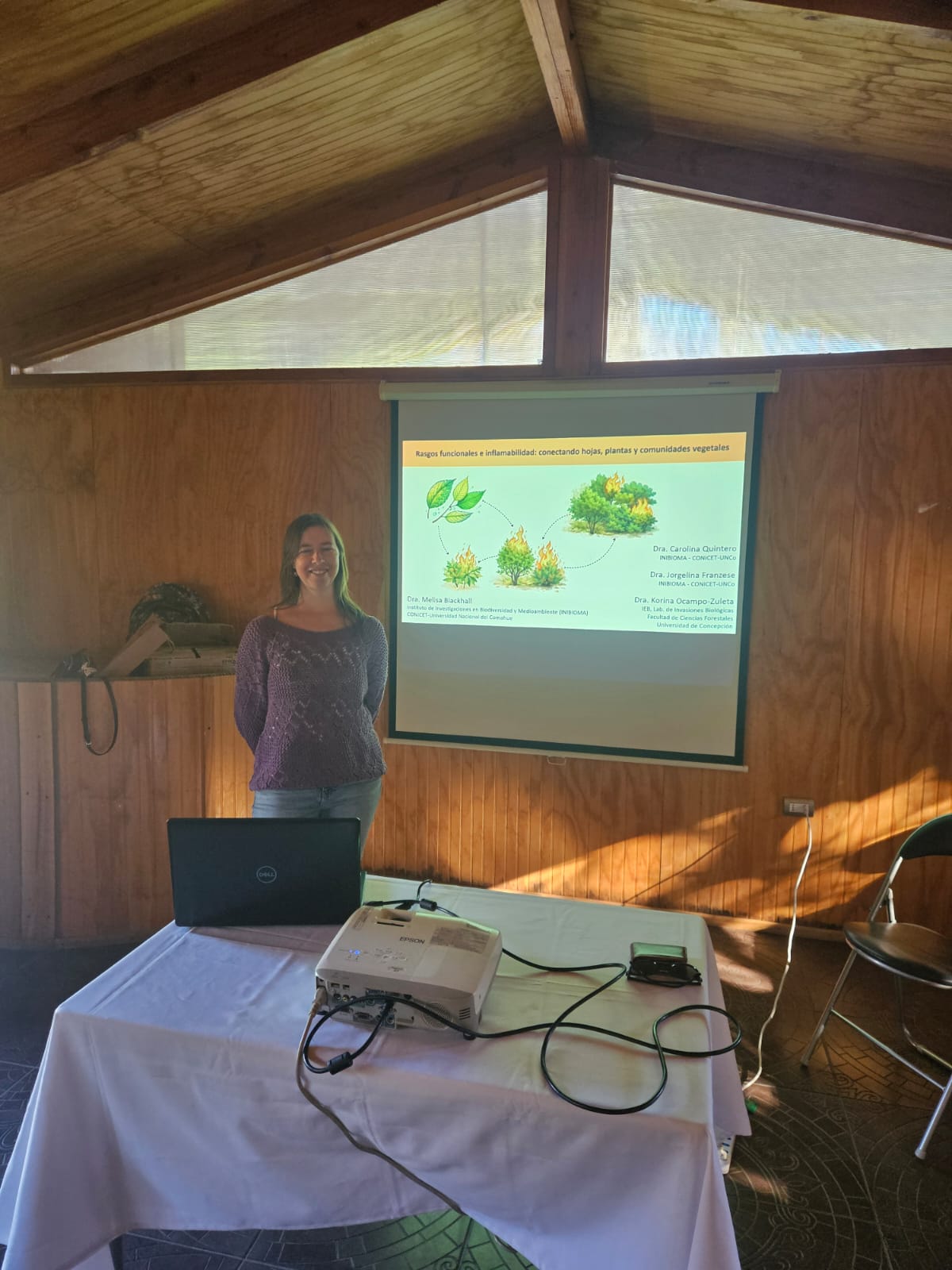 Uno de los principales hitos de la jornada fue la participación de la Dra. Melisa Blackhall (INIBIOMA-CONICET, Argentina), quien presentó la charla “Rasgos funcionales e inflamabilidad: conectando hojas, plantas y comunidades vegetales”, acercando a la comunidad a conceptos fundamentales para comprender la dinámica del fuego en los ecosistemas.