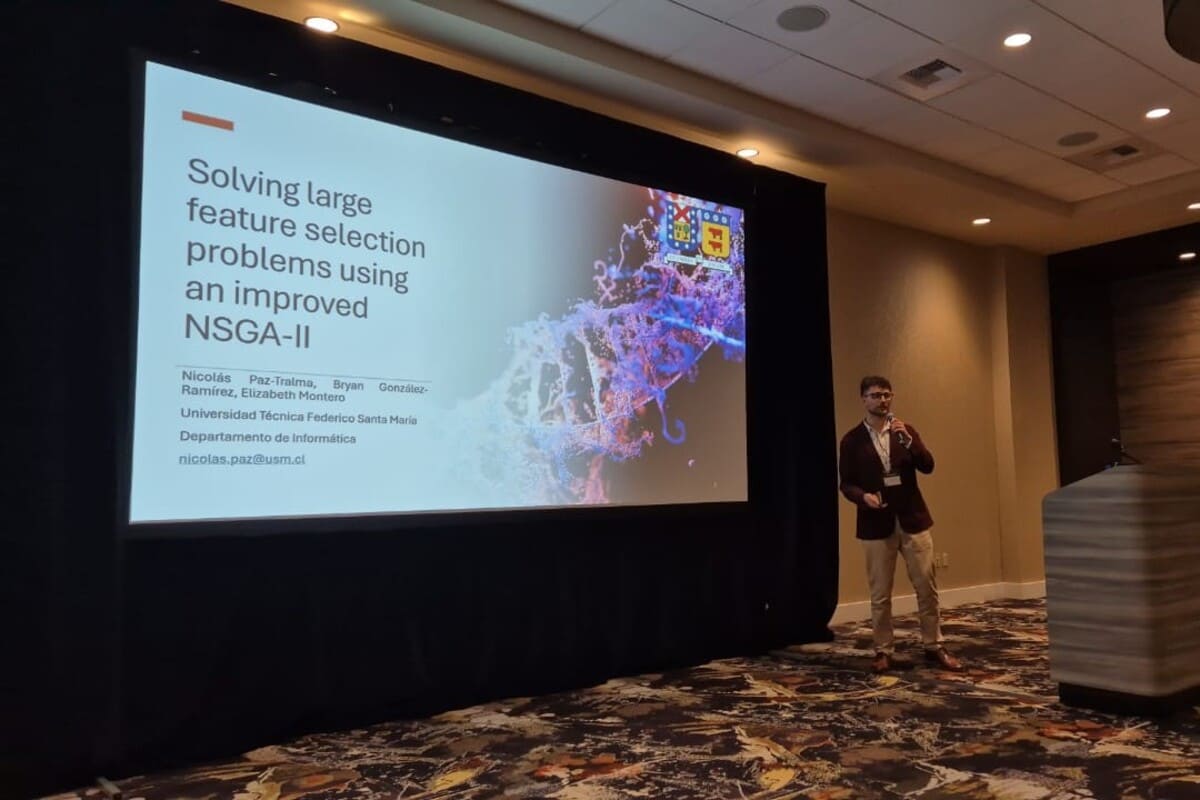 Por su parte, Nicolás Paz presentó el tema “Selección de características como un problema multi-objetivo a través de la adaptación del algoritmo NSGA-II”, el cual propuso y evaluó nuevas estrategias de inicialización, mutación y reducción de características basadas en métodos de filtro. El objetivo se centró en mejorar la eficiencia y el desempeño de la clasificación en escenarios de alta dimensionalidad.