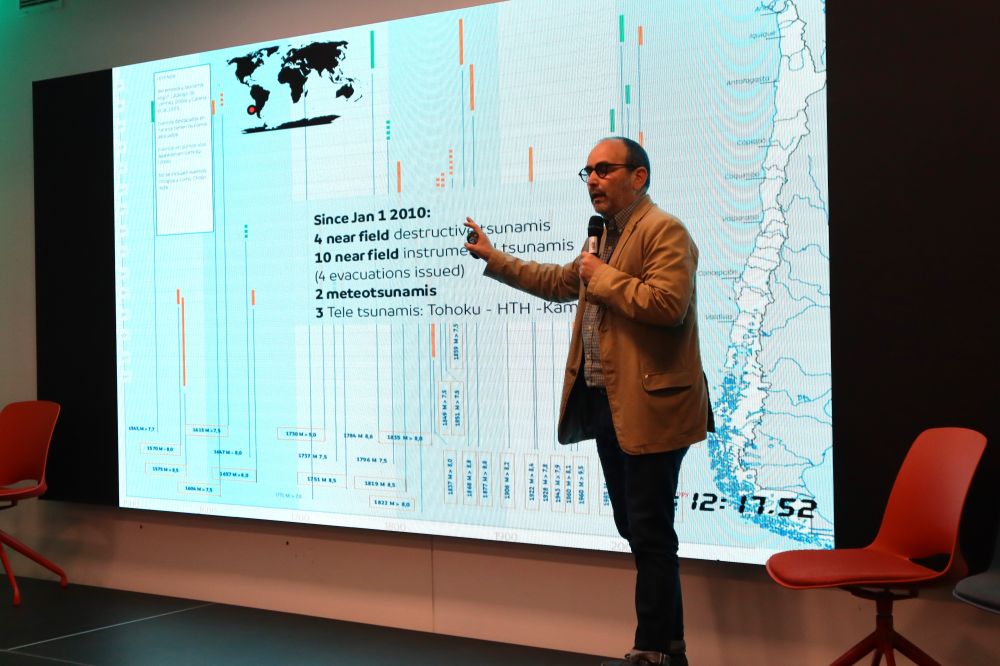 Durante dicha instancia, Catalán presentó el estado del arte en torno a la caracterización de amenazas costeras de origen climático —como marejadas e inundaciones— y tectónico —como tsunamis—, abordando sus impactos en un contexto de cambio global.
