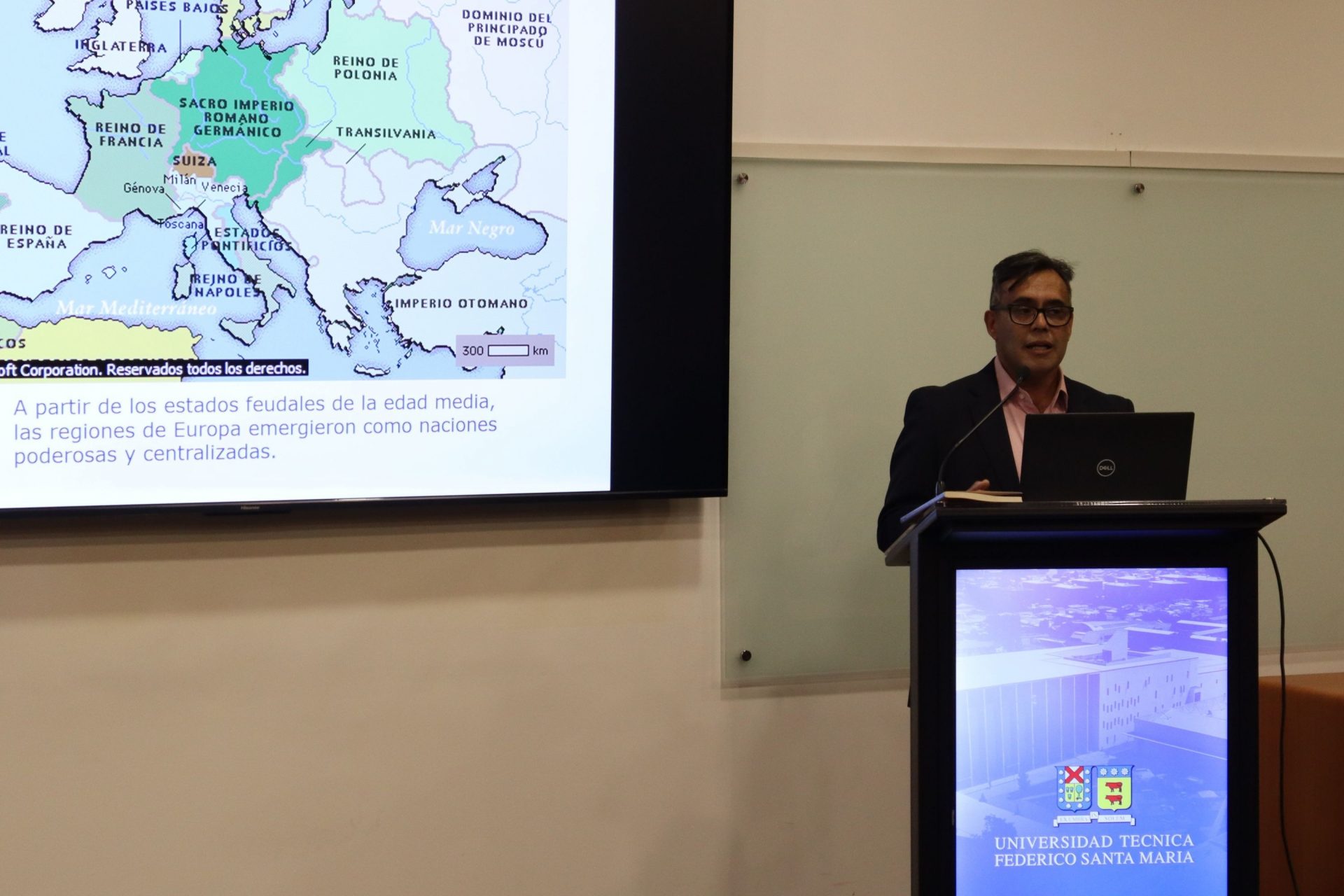 El Departamento de Estudios Humanísticos de la Universidad Técnica Federico Santa María realizó en Campus San Joaquín la conferencia “Potencias y nuevo orden mundial”, dictada por Gilberto Aranda, profesor titular del Instituto de Estudios Internacionales de la Universidad de Chile y destacado analista internacional.